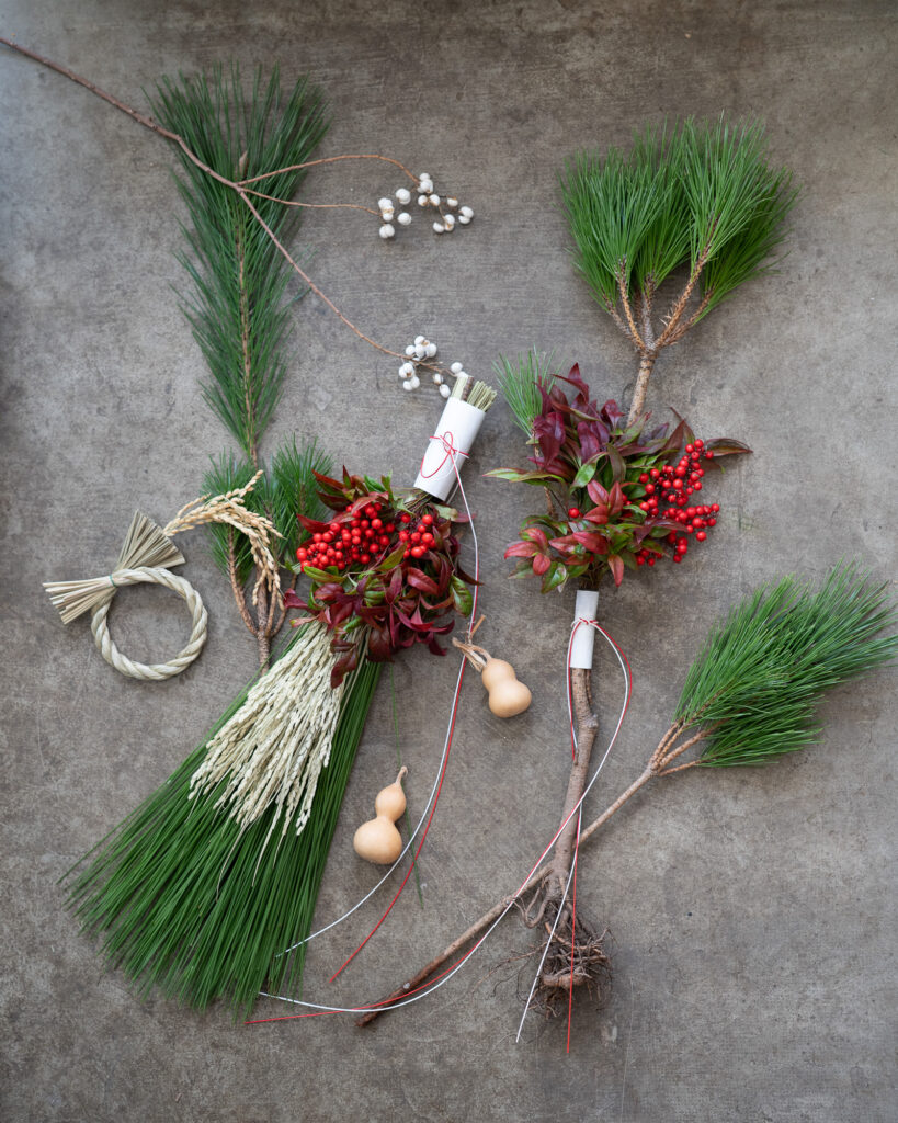 大王松、若松、根引松、赤松を店内からお選びいただき、南天や稲穂などの飾り付けをしてゆきます。 花材の選び方や束ね方でそれぞれの形が出来上がります。